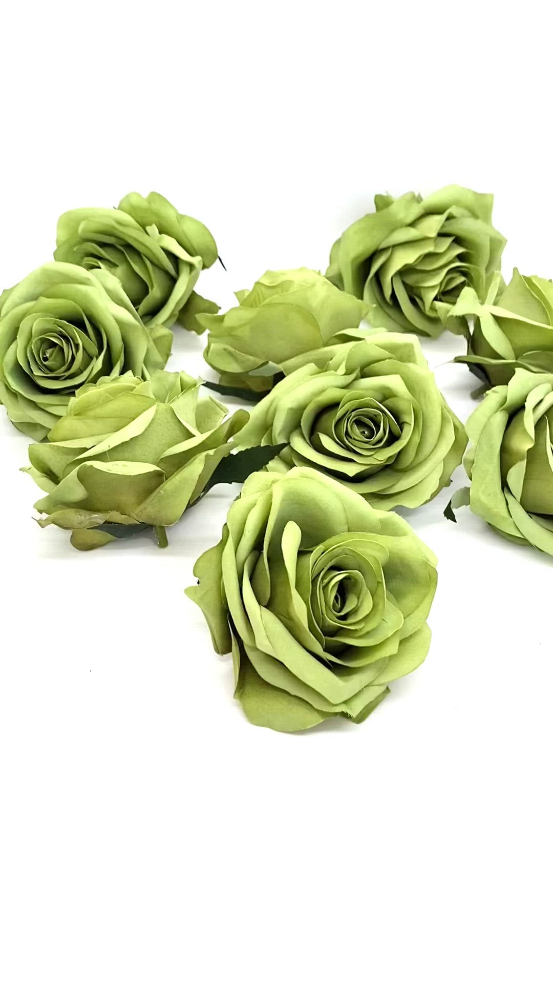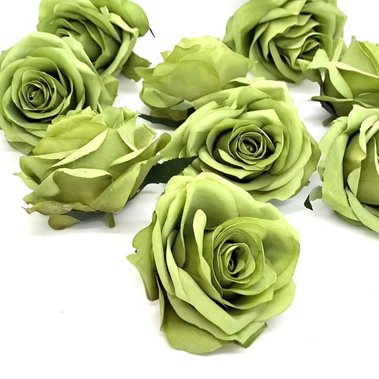 This artificial rose head is a gorgeous shade bold apple green! It is a unique saturated tone of medium apple green. The rose is very sturdy with many petals and layers and it holds its shape beautifully. This is for the rose head and it has a small stem behind it as shown.