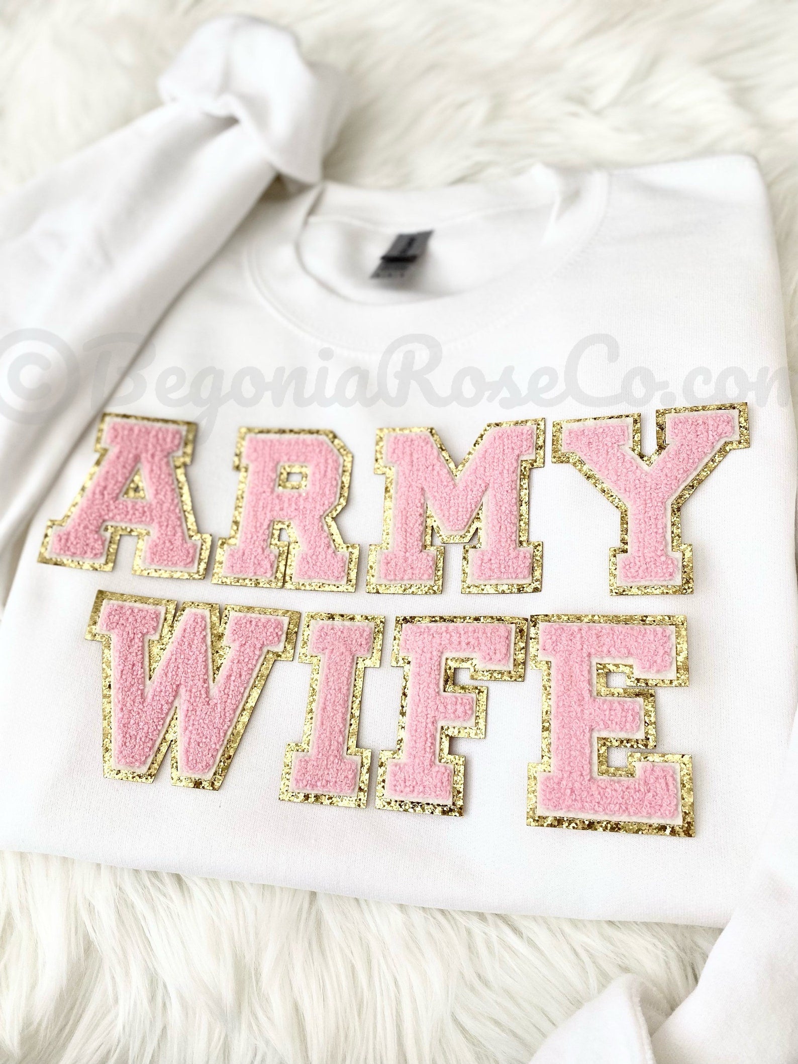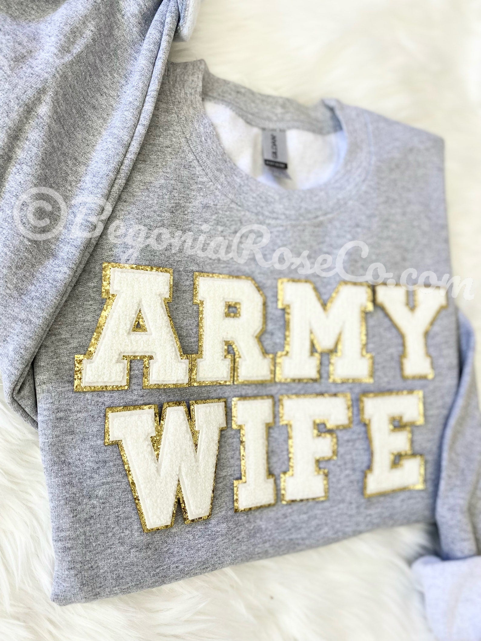 This cozy chenille patch ARMY WIFE sweatshirt is the perfect crewneck sweatshirt / Army wife gift! The sweatshirt is the Gildan brand unisex sizing. They run true to size so if you'd like a baggy sweatshirt we recommend sizing up. It is crewneck, long sleeve and has elastic at the sleeve cuff and bottom waistband. We offer 4 sweatshirt colors (white, grey, sand, and black) and 2 patch colors (light pink and cream white). Colors may appear slightly different in person versus on the computer screen and our photos all show natural lighting. The patches are heat pressed on and all designs are hand placed, therefore there may be a slight difference in positioning of the design than the ones pictured.