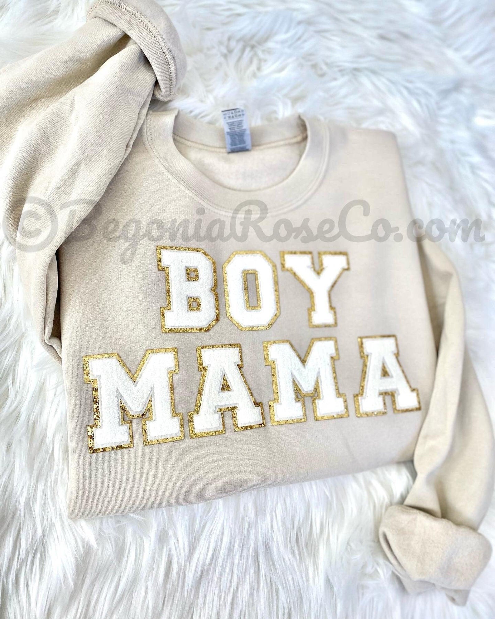 This cozy chenille patch BOY MAMA or BOY MOM sweatshirt is the perfect crewneck sweatshirt for your favorite MAMA or mama to be. The sweatshirt is the Gildan brand unisex sizing. They run true to size so if you'd like an oversized fit we recommend sizing up. It is crewneck, long sleeve and has elastic at the sleeve cuff and bottom waistband. We offer 4 sweatshirt colors (white, grey, sand, and black) and 2 patch colors (light pink and off-white). Colors may appear slightly different in person versus on the computer screen and our photos all show natural lighting. The patches are heat pressed on and all designs are hand placed, therefore there may be a slight difference in positioning of the design than the ones pictured. This would make a great baby shower gift, mama to be gift, Mother's Day gift, valentine's day gift, pregnancy announcement shirt, best friend gift, sister gift, mom gift or daughter gift.