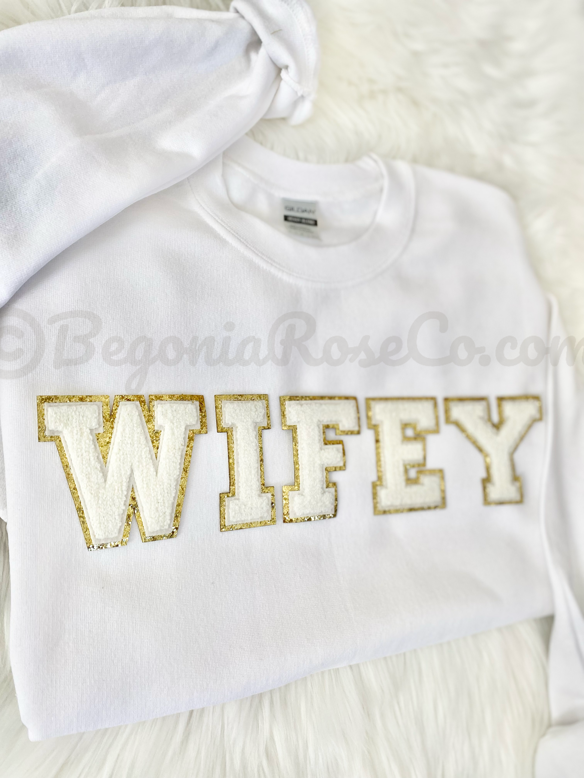 This cozy chenille patch WIFE or WIFEY sweatshirt will be your favorite go-to sweatshirt, perfect for those lazy weekend mornings or for going out on the town while still being comfy. The sweatshirt is the Gildan brand unisex sizing. They run slightly looser than standard women's sizing, however if you'd like a baggy sweatshirt we recommend sizing up. It is crewneck, long sleeve and has elastic at the sleeve cuff and bottom waistband. We offer 4 sweatshirt colors (white, grey, sand, and black) and 3 patch colors (light pink, aqua and cream white). Colors may appear slightly different in person versus on the computer screen and our photos all show natural lighting. The patches are heat pressed on and all designs are hand placed, therefore there may be a slight difference in positioning of the design than the ones pictured. This would make a great bridal shower gift, anniversary gift, birthday gift, Valentine's Day gift, engagement party gift, honeymoon shirt or a just-because gift.