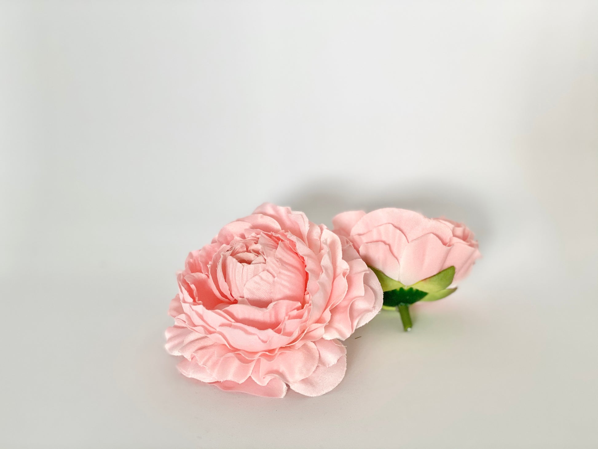 This peachy pink ranunculus is a beautiful warm medium pink color with so many stunning layers of fabric to make up its petals. The fabric is thick and feels very sturdy. This ranunculus comes in two sizes, medium and large. It is a stunning ranunculus and makes a beautiful statement within a design or arrangement.