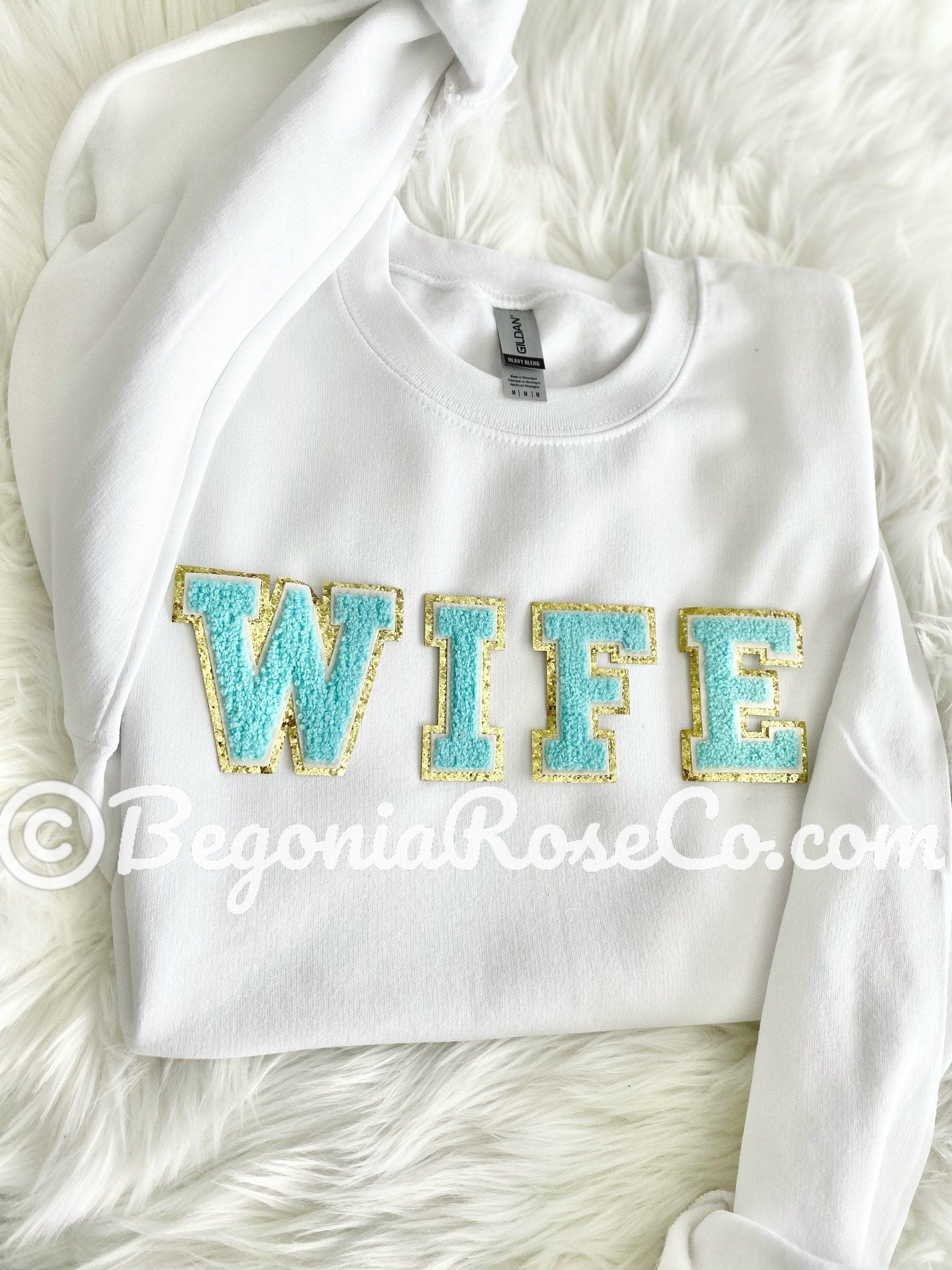 This cozy chenille patch WIFE or WIFEY sweatshirt will be your favorite go-to sweatshirt, perfect for those lazy weekend mornings or for going out on the town while still being comfy. The sweatshirt is the Gildan brand unisex sizing. They run slightly looser than standard women's sizing, however if you'd like a baggy sweatshirt we recommend sizing up. It is crewneck, long sleeve and has elastic at the sleeve cuff and bottom waistband. We offer 4 sweatshirt colors (white, grey, sand, and black) and 3 patch colors (light pink, aqua and cream white). Colors may appear slightly different in person versus on the computer screen and our photos all show natural lighting. The patches are heat pressed on and all designs are hand placed, therefore there may be a slight difference in positioning of the design than the ones pictured. This would make a great bridal shower gift, anniversary gift, birthday gift, Valentine's Day gift, engagement party gift, honeymoon shirt or a just-because gift.